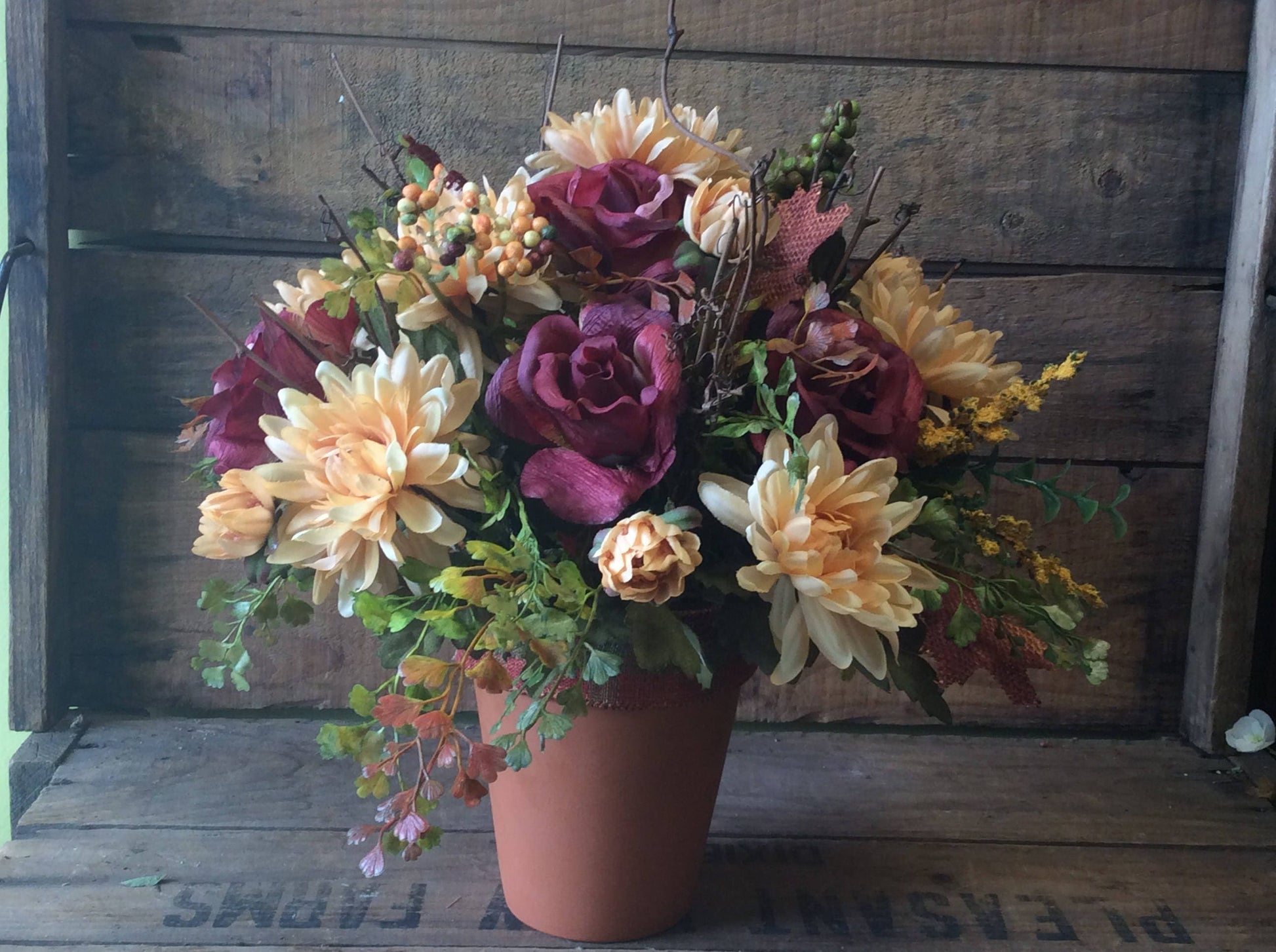 Artificial Fall Floral Arrangement in a terra cotta pot.