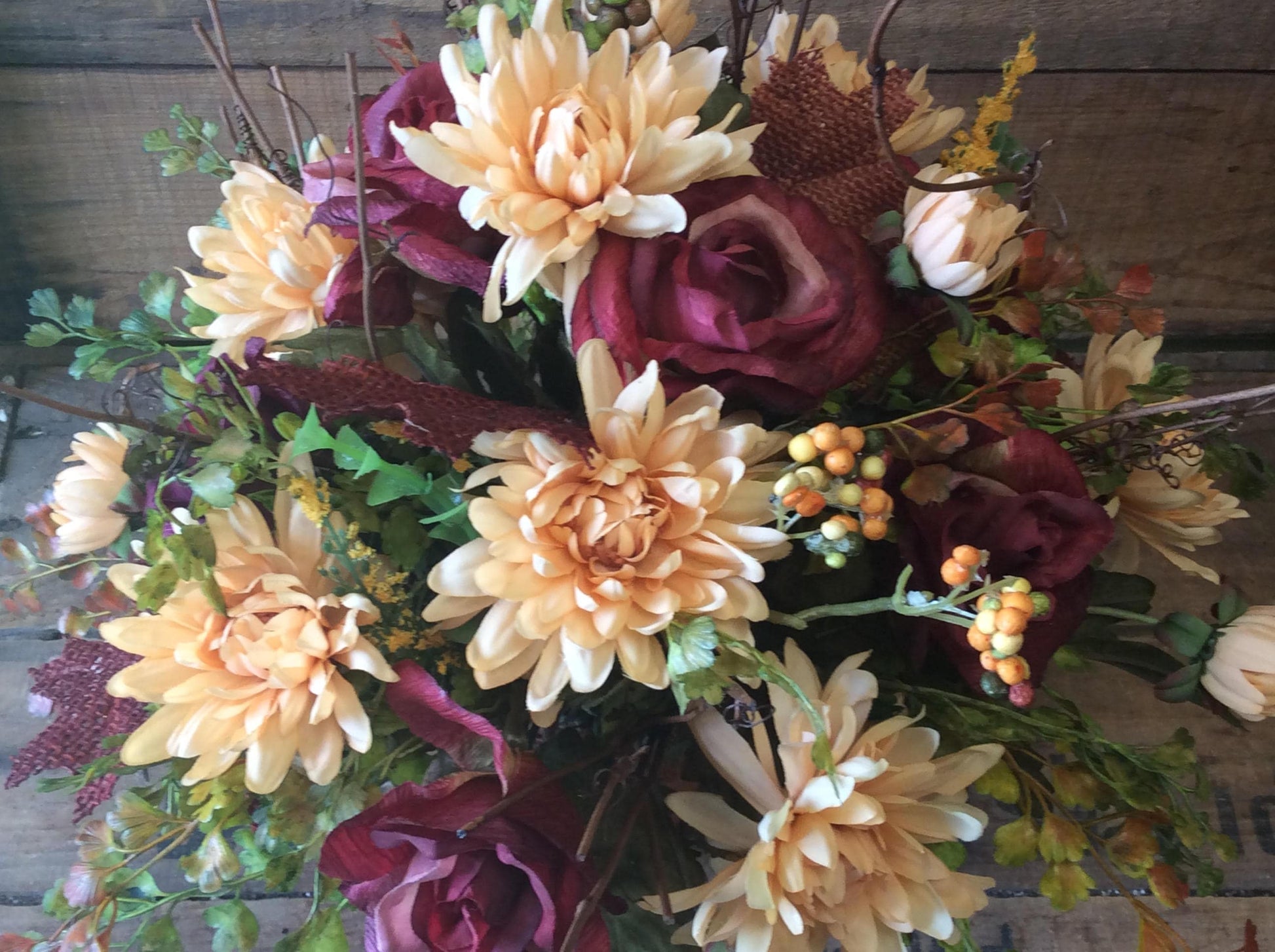 Burgundy roses, butterscotch chrysanthemums, trailing maden hair fern, burlap oak leaves, grapevine twigs, bittersweet berries,