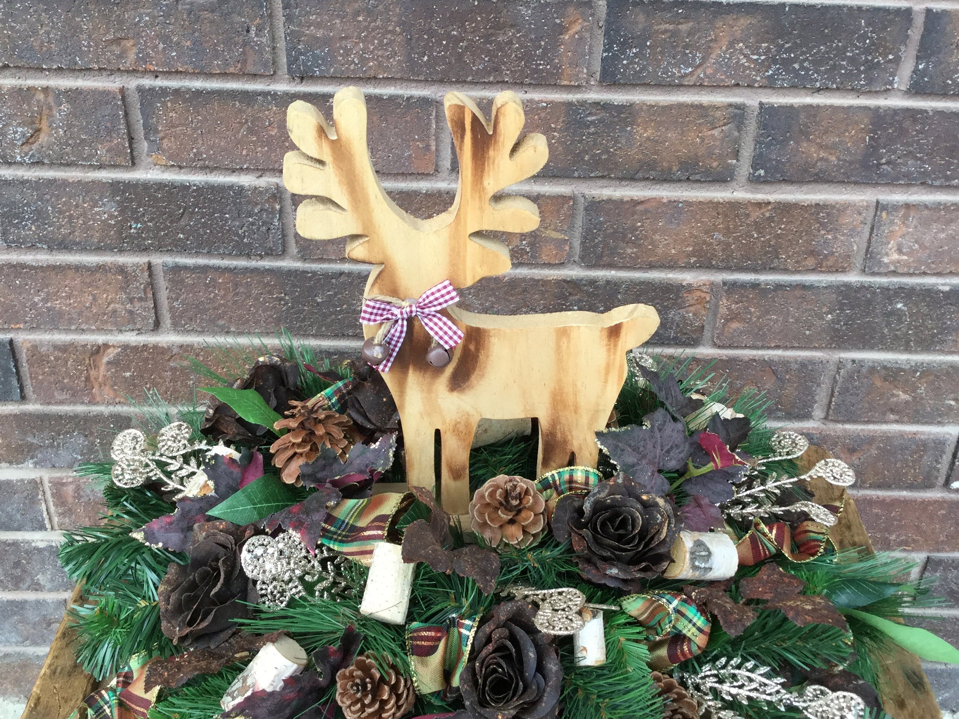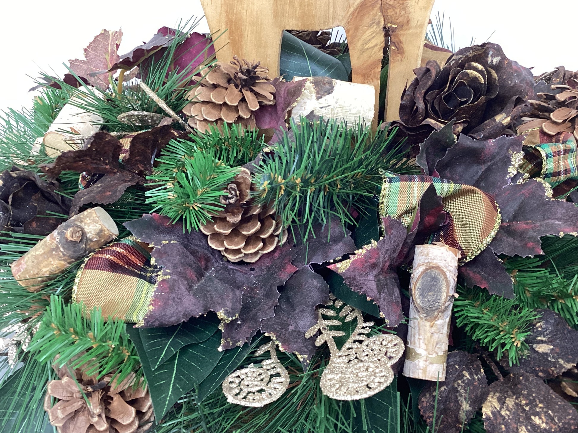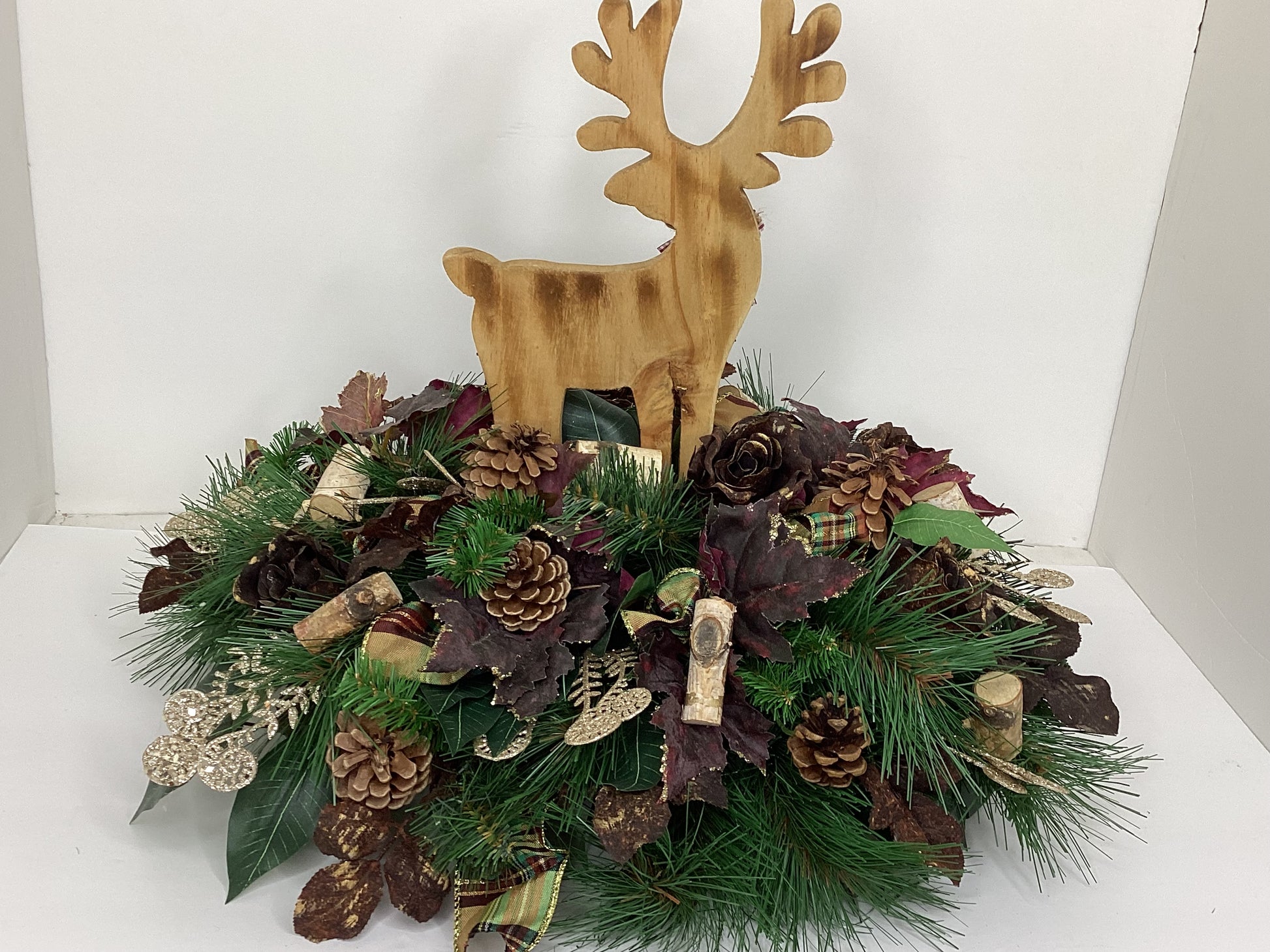 With a base of dark green evergreen boughs and ficus leaves. Metallic gold peacock curls, natural pine cone, mini white birch logs, dark brown gold edged roses and ivy leaves. Perched in the centre - a wooden Reindeer. Finished with a wired plaid ribbon in matching tones.