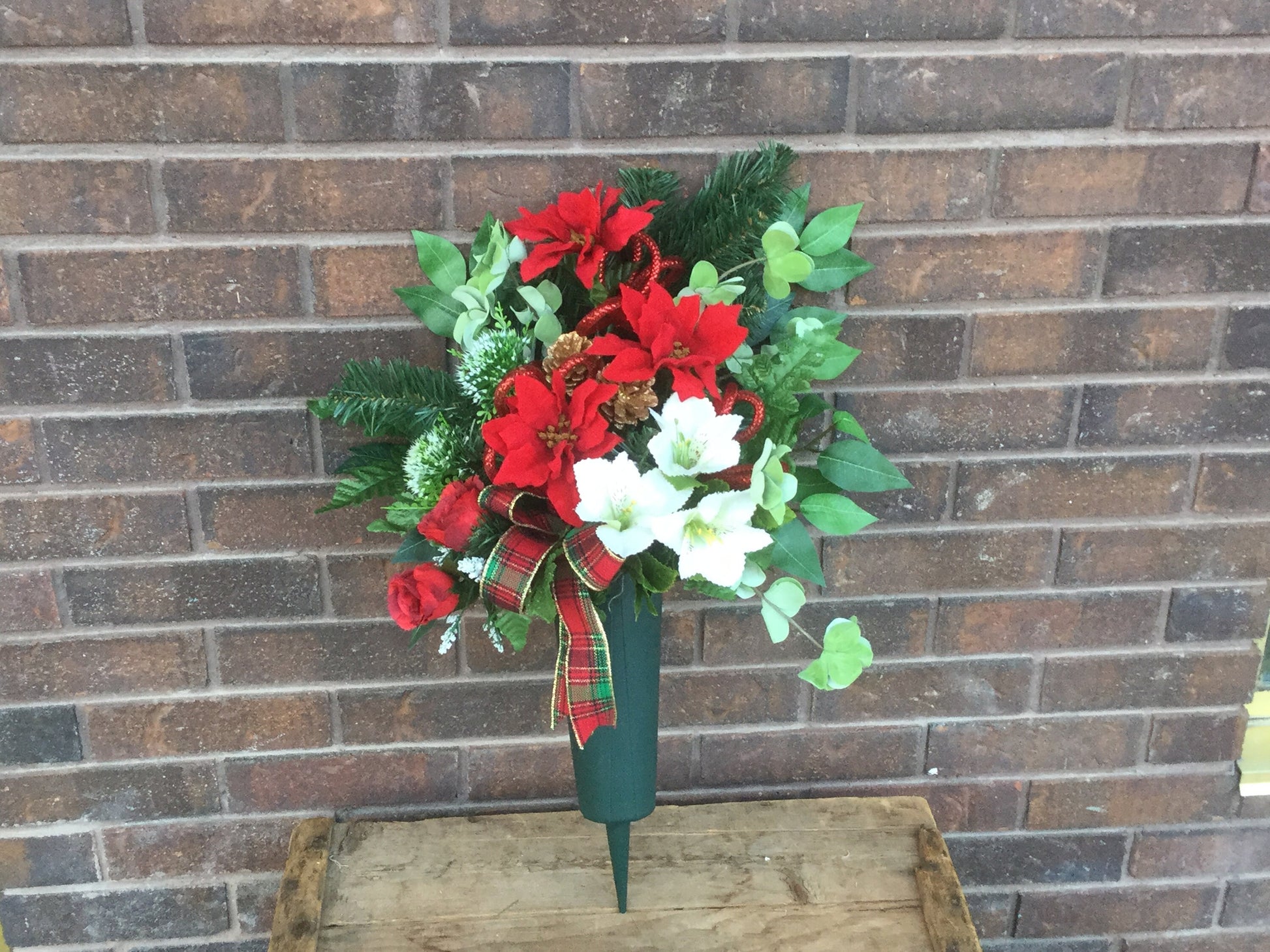 Artificial Flower Arrangements for a Grave marker. Christmas Red and white arrangements, made with red poinsettias, red roses, white alstroemerias blooms, evergreen , leather leaf fern and ficus leaves. Accented with tartan red ribbon. Pine cones