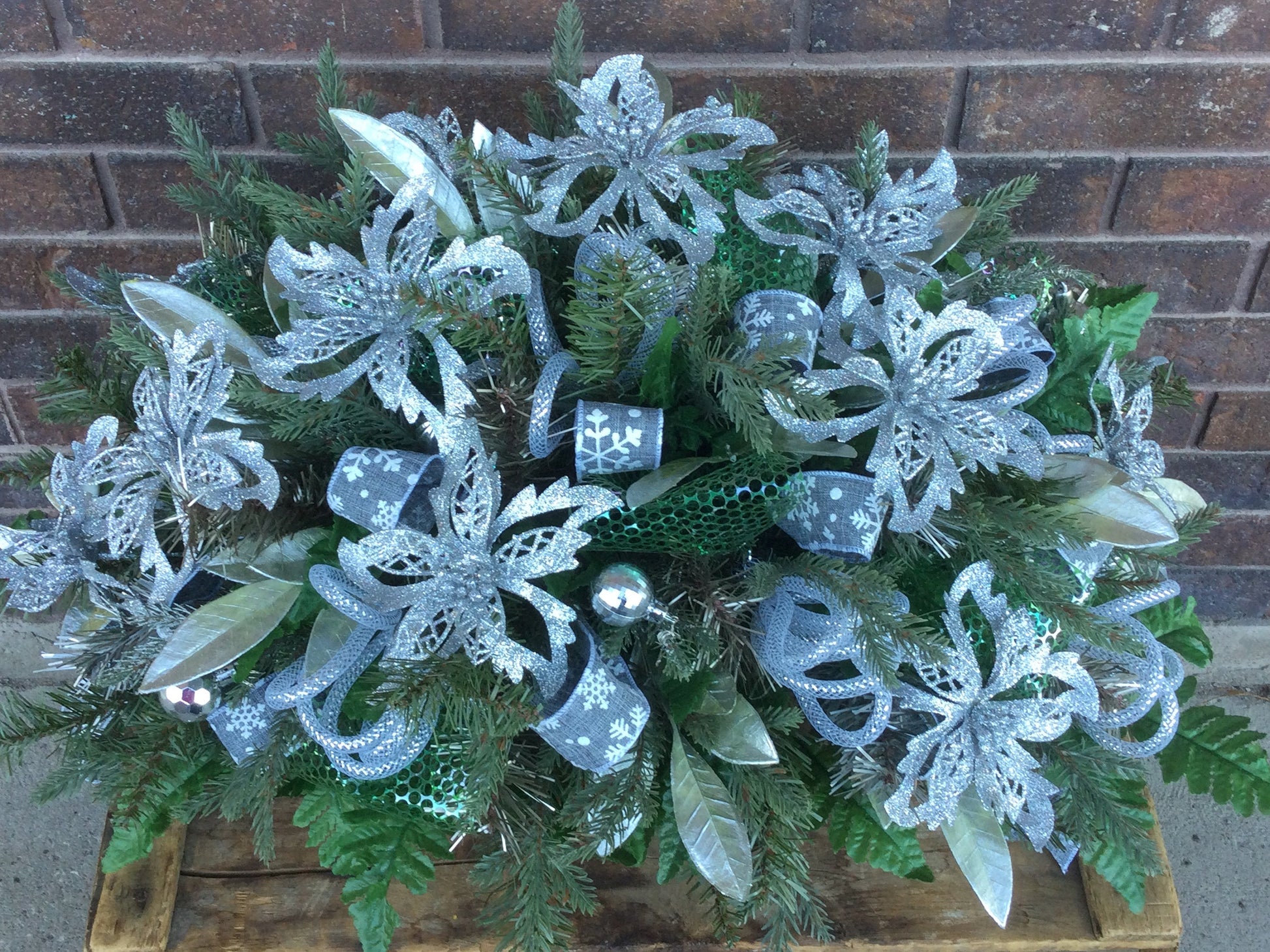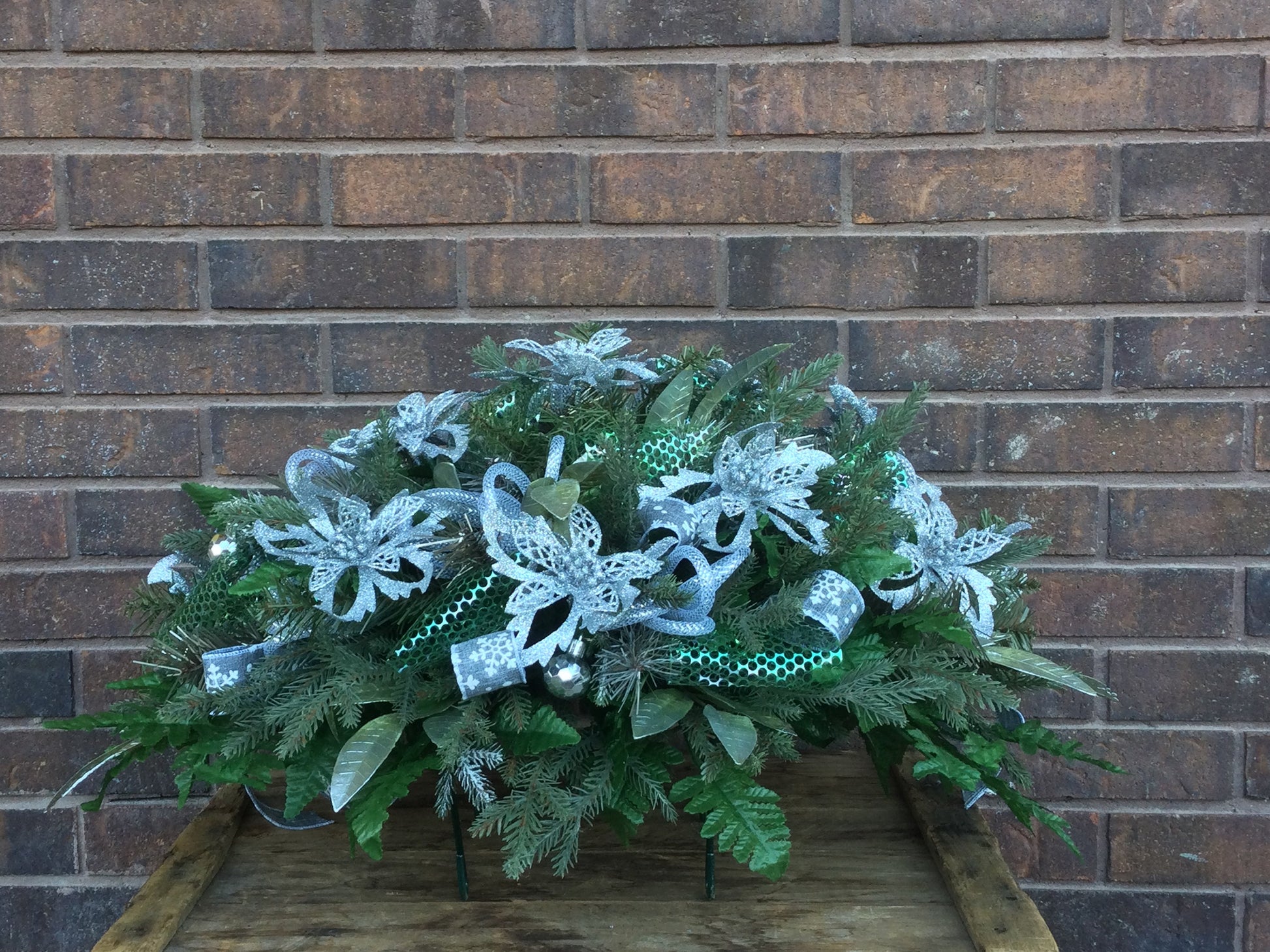 Beautiful Christmas floral arrangement for cemetery headstone. Made with silver metallic poinsettia blooms and stems of silver metallic leaves. Finished with lots of green evergreen boughs, leather leaf fern with silver metallic roping, metallic green punchenello ribbon and wired snowflake ribbon. .