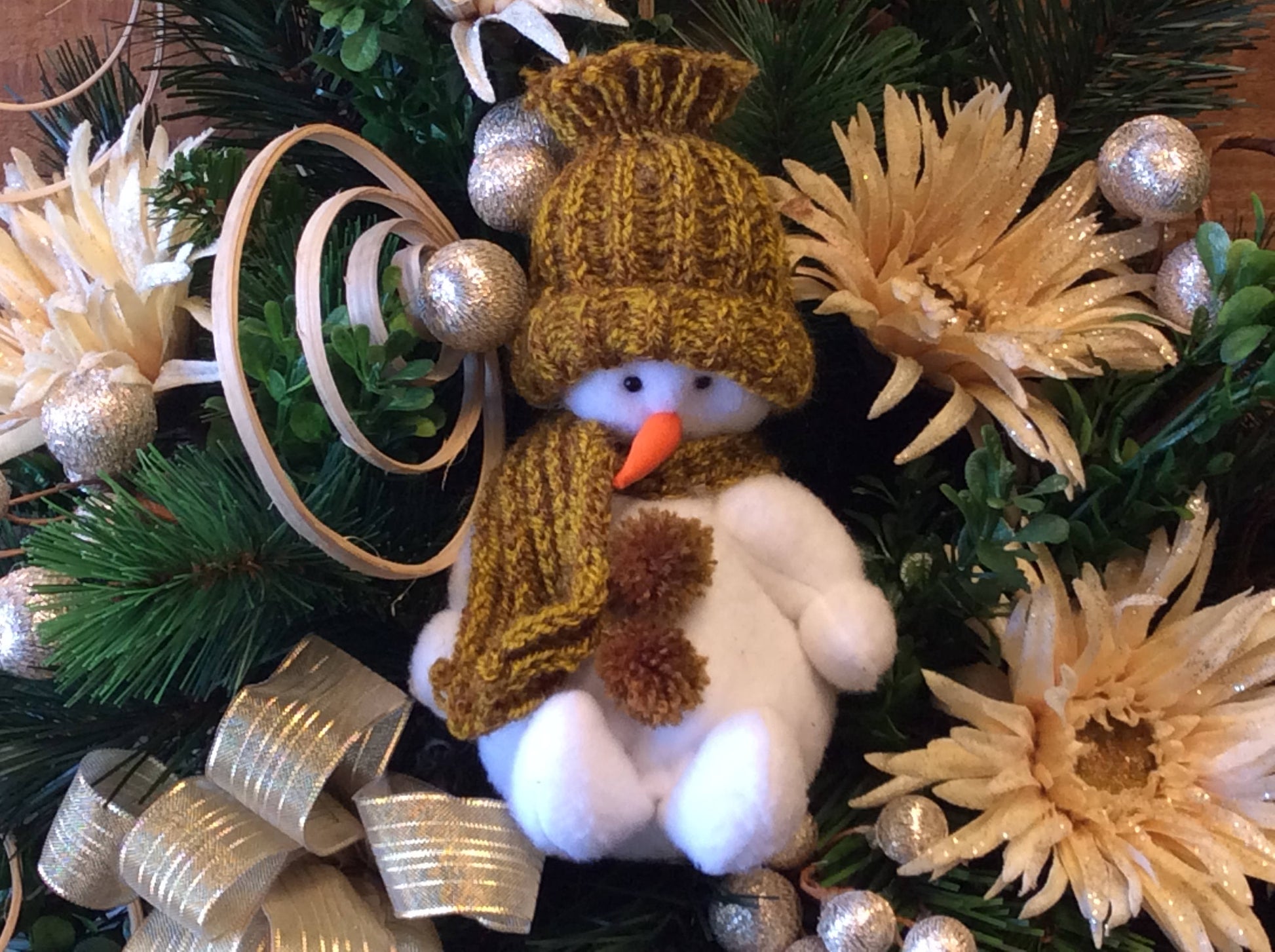 This flower arrangement is designed in a dark wicker wall basket filled with Christmas evergreen boughs and dark green boxwood. Large cream gerbera daisies with gold sparkles are the main flowers, accented with stems of artificial gold balls and bleached willow curly cues. Perched in the middle a cute stuffed white snowman wearing a gold hat and scarf. Finished off with a gold metallic bow and ribbon tails.