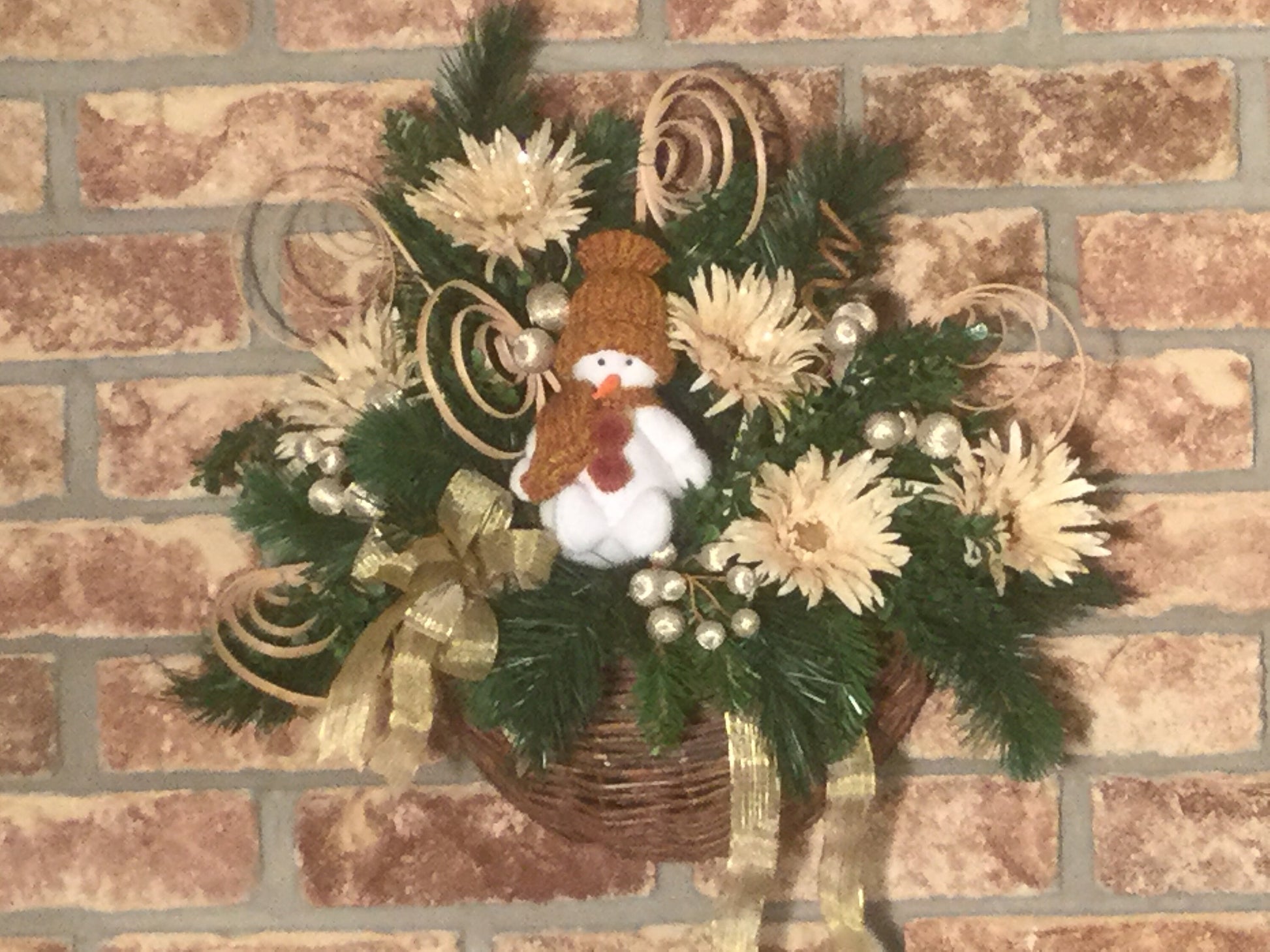 Christmas Arrangement, Wicker Flower Basket, Winter Door Decor, Snowman Floral Decoration, Christmas Evergreen Arrangement, Made In Canada