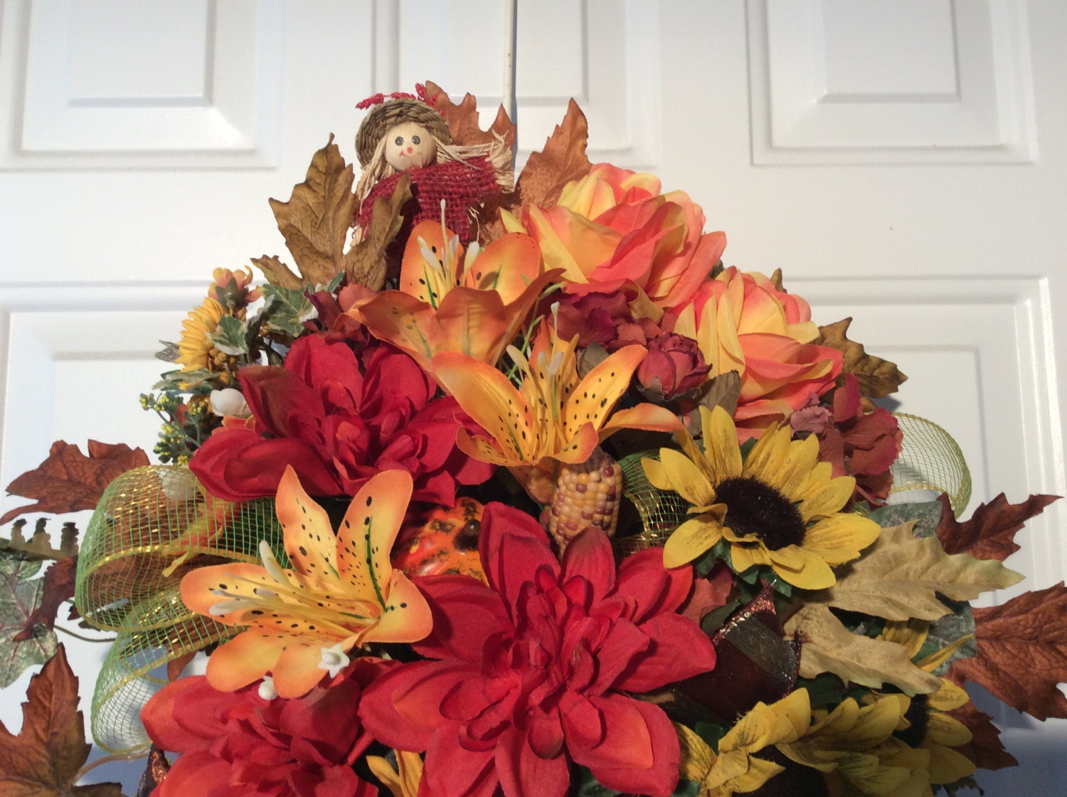 Flowers are large Sunflowers, dark orange dahlias, Tiger Lilies and Roses, Soft brown Hydrangea, yellow Daisies and Roses, Autumn Maple Leaves, Trailing Ivy and Maiden Hair Fern add to this beautiful Fall arrangement. Finishing touches are Autumn Scarecrow, corn cobs, pumpkin, matching green deco mesh ribbon and two-tone gold and brown ribbon. If you like the pictures, I'm sure you love this handmade Fall Floral display.