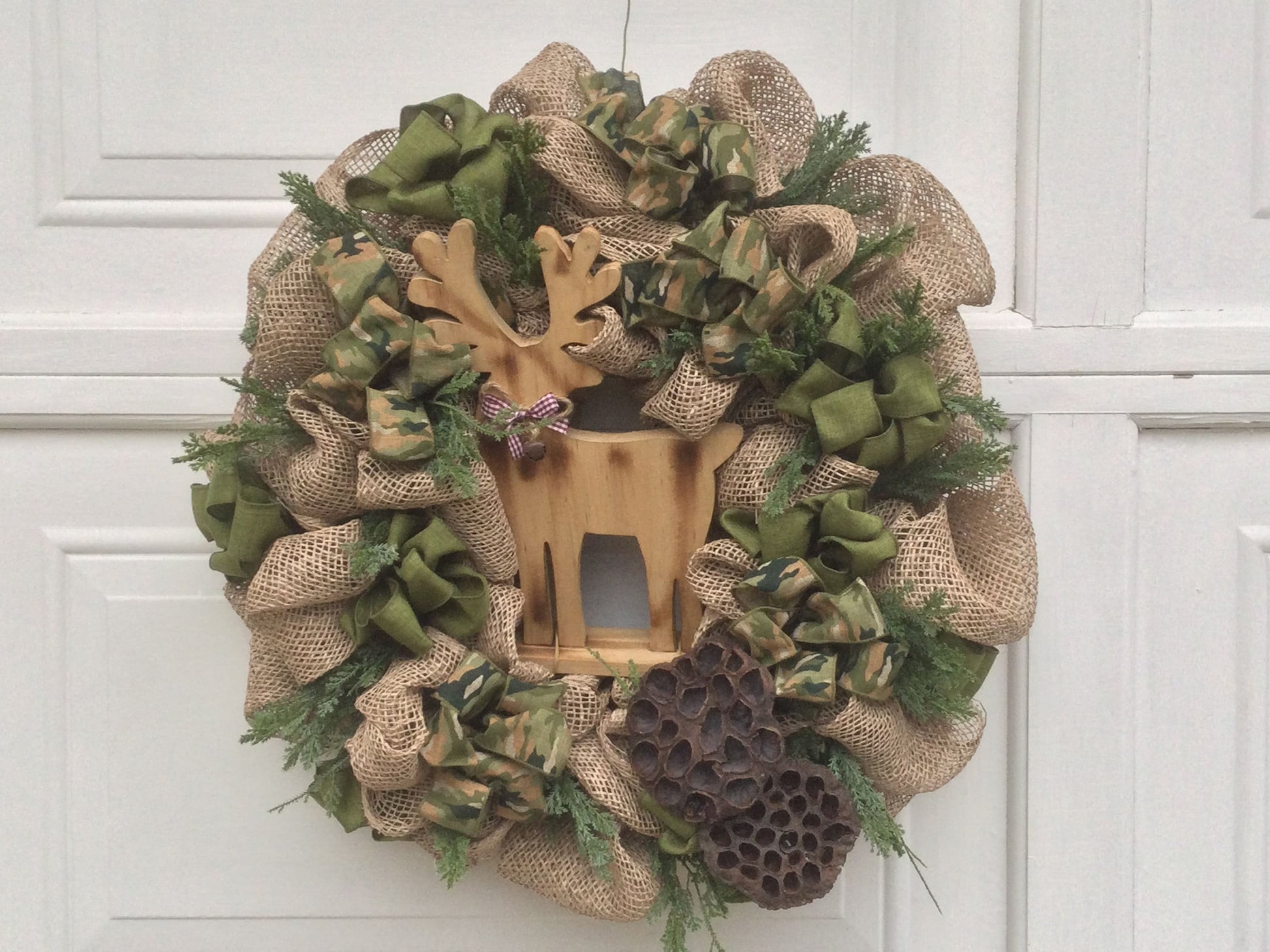 Welcome the festive season with this one of a kind Reindeer wreath. The base is made of natural coloured faux mesh burlap on a wire frame. Set you sight on the Rustic wooden Reindeer perched in the middle, surrounded by artificial cedar stems, accented with wired moss green ribbon and wired camouflage ribbon. With dried lotus pods.