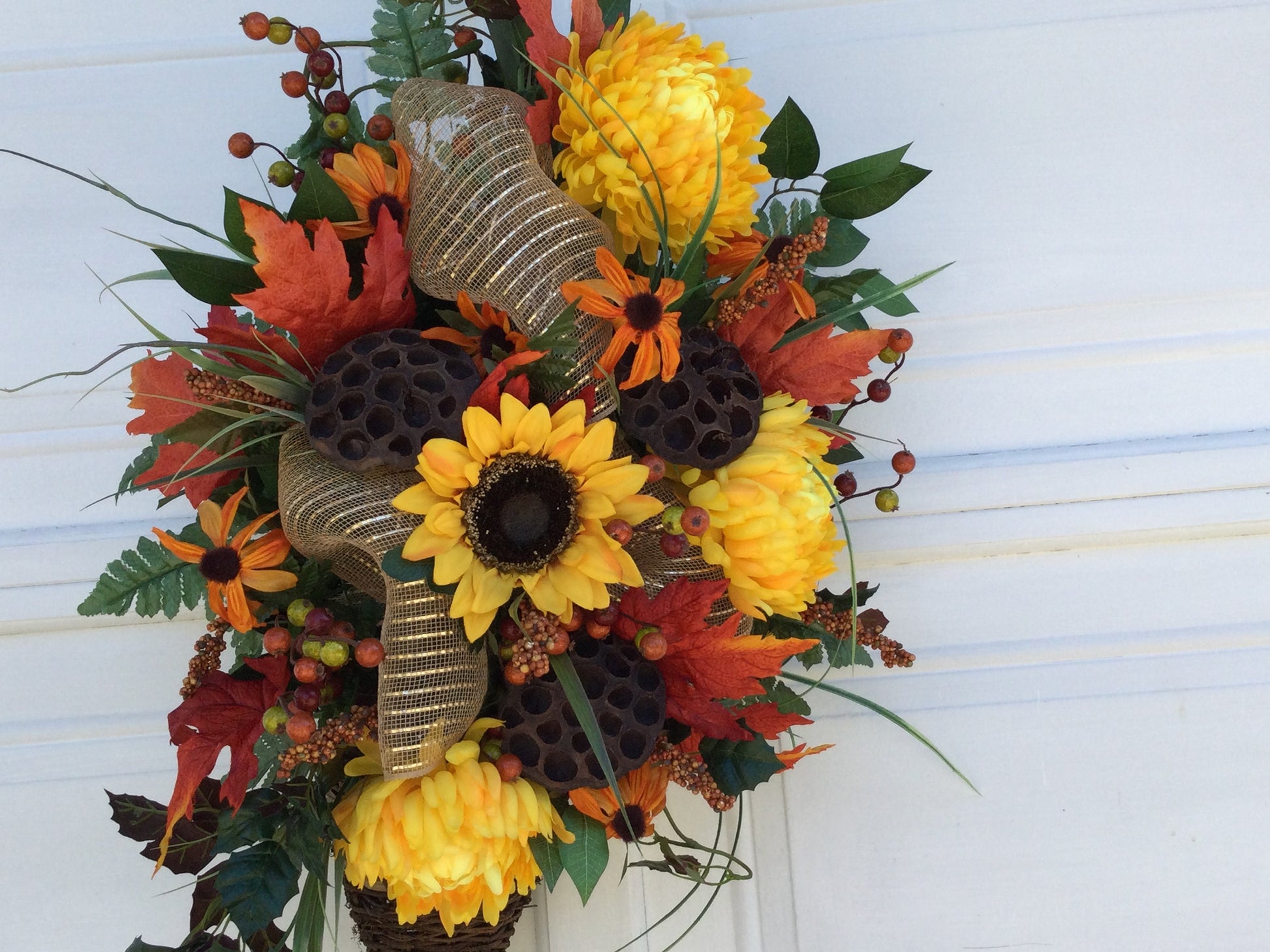 Beautiful orange-red maple leaves, leather fern, ficus leaves, grape ivy vines and grasses are used as the base to showcase the brilliant yellow large chrysanthemums and sunflower. With black eyed susans in orange, berry stems and dried lotus pods. Finished with gold striped natural deco mesh.